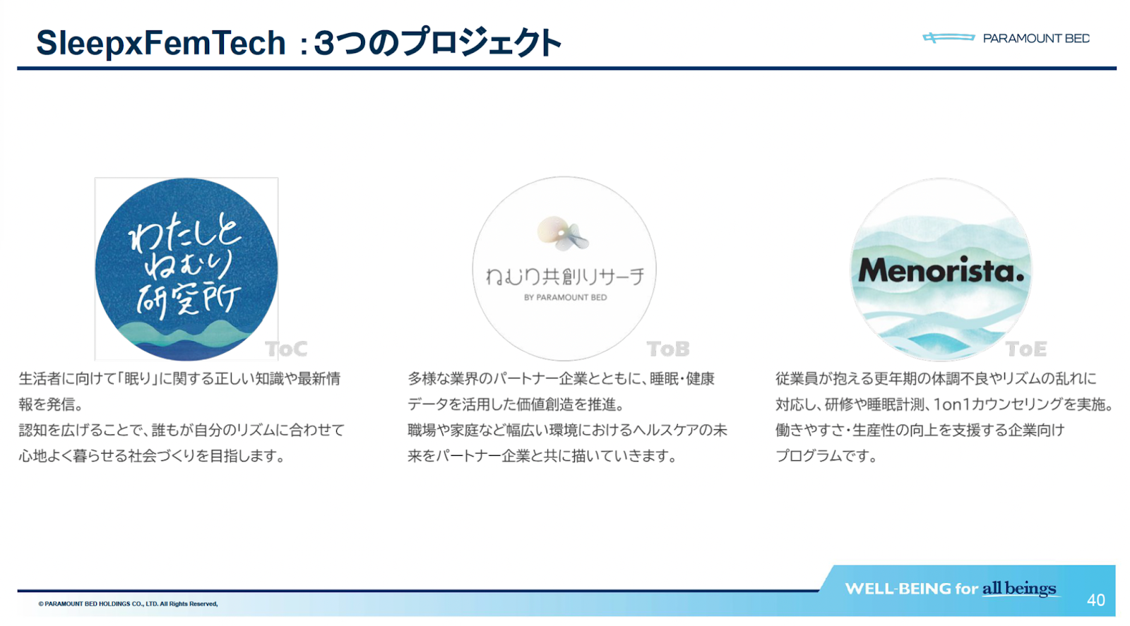 「長年の睡眠研究の知見を、女性の不調改善に役立てたい」。そんな想いから2022年に立ち上がった「Sleep×FemTechプロジェクト」は、経済産業省や専門家との連携を重ね、いまではパラマウントベッドの公式な取り組みとして発展しています。