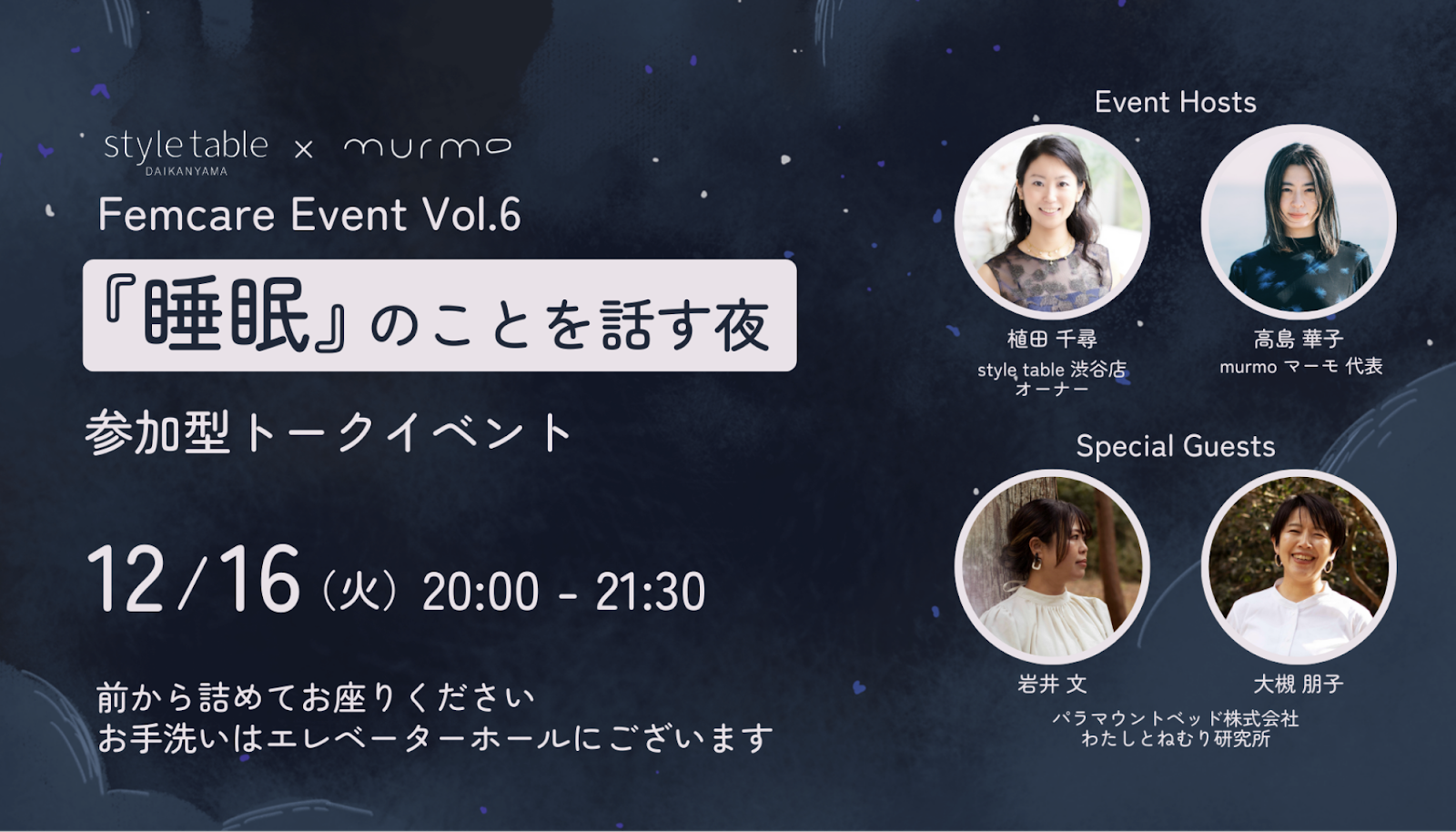 「エシカル×サステナブル×ヴィーガン」をコンセプトにするセレクトショップ「style table for ethical gifts」と、月経カップから始まる生理用品ブランド「murmo(マーモ)」が共同で開催する「Femcare Event」。フェムケアやセルフラブなど、多様なテーマを取り上げてきた本イベントの第6回に「わたしとねむり研究所」がゲストとして参加しました。今回のテーマは、「わたしとねむり研究所」のコンセプトでもある、女性のからだや健康と切り離すことのできない『睡眠』 です。「今のねむりに満足できているか」「眠れない背景には、どんな要因があるのか」。そんな小さな“疑問”をきっかけに、自身の生活リズムや心身の変化を見つめ直す機会となった、今回の参加型トークイベント。この記事では、当日の様子をレポートします。
