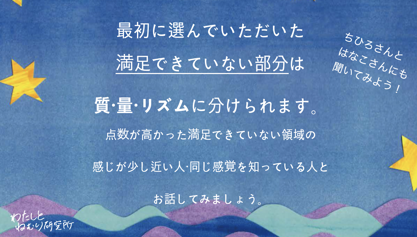 その結果、「満足できていないカテゴリ(量・質・リズム)」と「影響が表れやすい要素(心・脳・身体・行動)」が可視化され、自身の睡眠タイプを客観的に把握することができました。