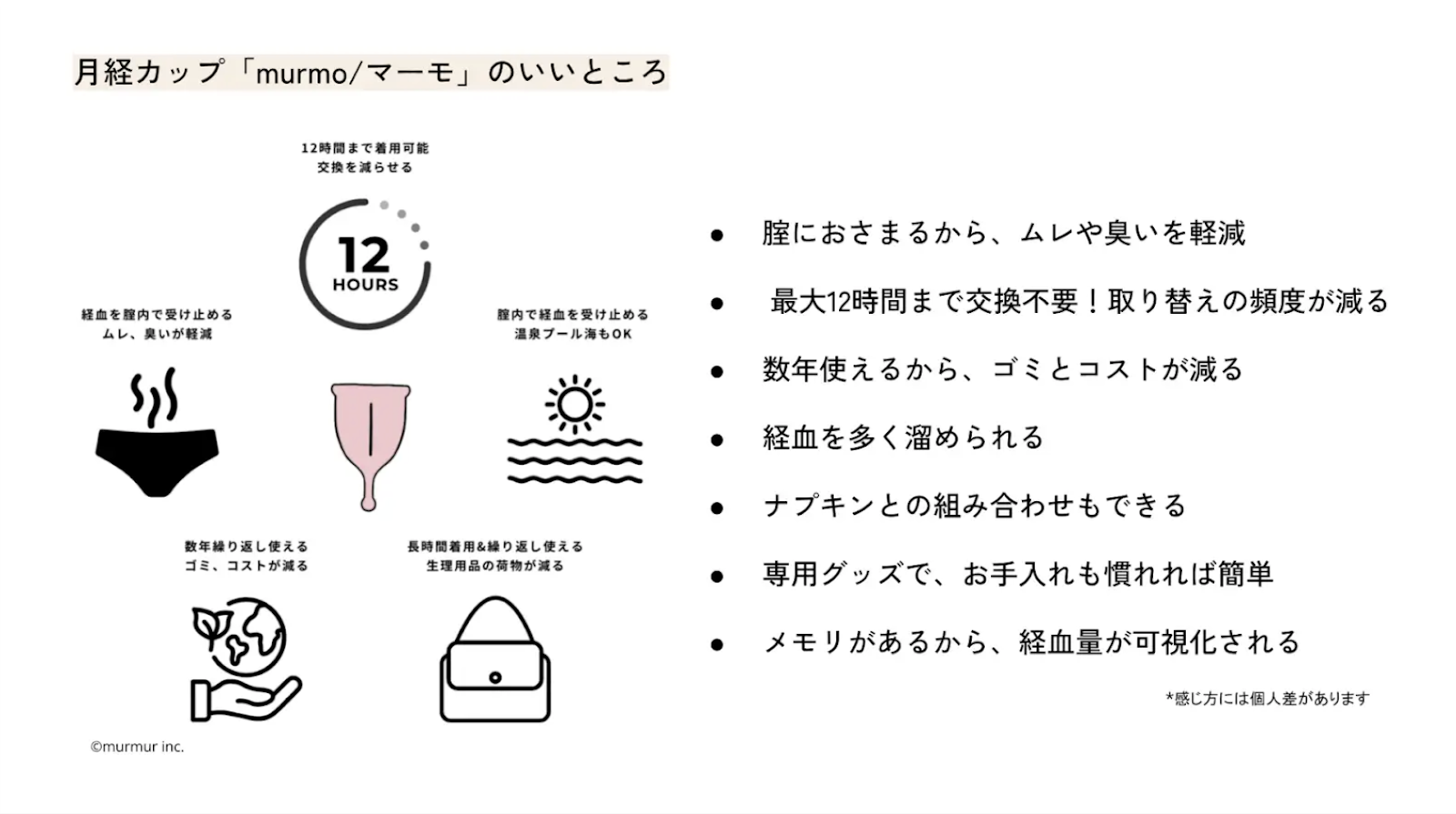 murmoが展開するのは、日本製・医療用シリコーンの月経カップ。最大12時間装着できるため生理用品の交換回数や持ち歩きのストックを減らせる、繰り返し使えることによる環境負荷の低減ができるといったメリットがあります。